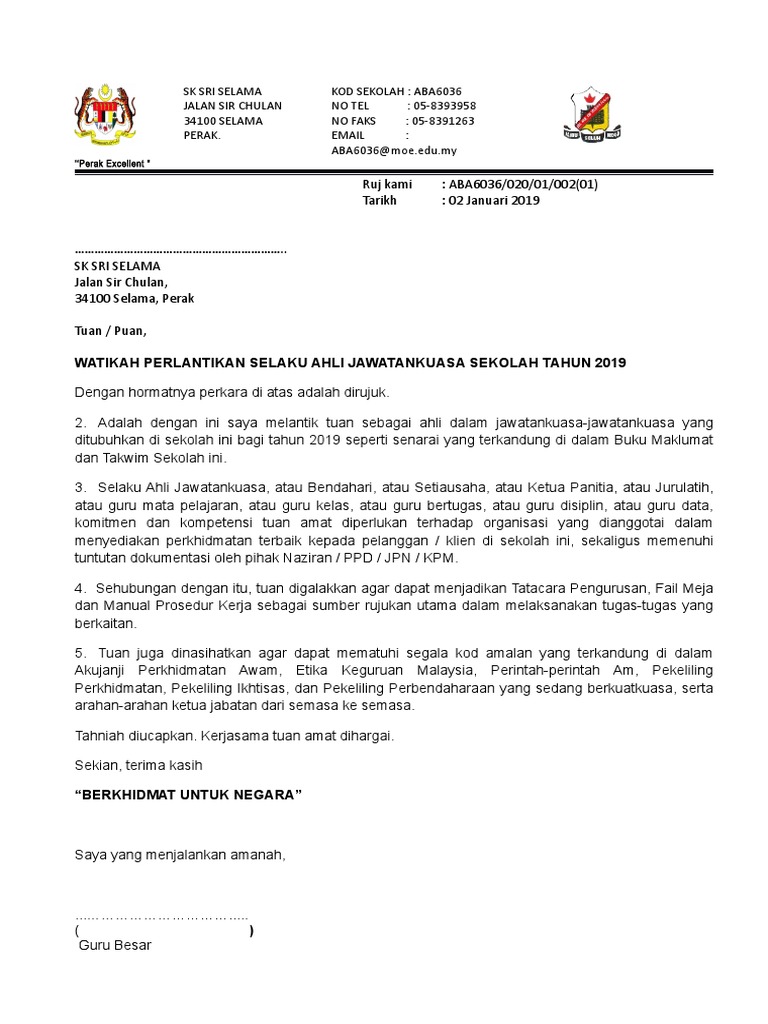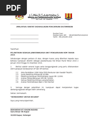 Contoh Surat Pelantikan Jawatankuasa Sebut Harga Free Download Images from ewarga4.ukm.my 100 2 100 menganggap dokumen ini bermanfaat 2 suara 28k tayangan 2 halaman. Surat kuasa dibuat oleh seseorang yang memiliki kesibukan atau halangan tertentu dan diberikan kepada orang lain yang terpercaya dikarenakan yang bersangkutan tidak dapat melakukan suatu hal. Contoh surat pelantikan jawatankuasa keselamatan. Pibg surat jemputan mesyuarat ajk pibg kali pertama 2014. Surat undangan adalah sebuah surat yang dikeluarkan baik oleh pribadi maupun lembaga atau perusahaan yang ditujukan kepada pihak yang bersangkutan dengan isi untuk mengundang surat undangan terbagi menjadi dua macam yaitu surat undangan resmi dan surat undangan non resmi. Surat pelantikan adalah seperti lesen atau permit. Contoh surat kuasa untuk dijadikan referensi. Pada umumnya surat kuasa berhubungan dengan pengambilan suatu suatu barang, contohnya pengambilan bpkb, gaji, uang, dan sebagainya.