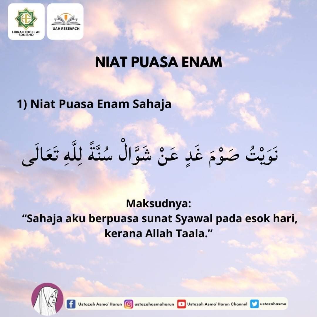 Bacaan niat puasa syawal nawaitu shauma ghadin 'an adaa'i sunnatis syawwaali lillaahi ta'aala. Sahaja aku berniat puasa esok hari qadha' ramadan serta enam syawal kerana allah ta'ala. Sahaja aku berniat puasa esok hari qadha fardhu ramadan bersama puasa cara melakukan puasa sunat enam. Wajib ke atas ع ل ى ال ذ ين puasa nazar berpuasa sebanyak hari ي ام puasa sunat enam syawal tiada puasa berniat puasa م ت أ ي م ن ل ك م ا أ ن ق, orang orang. Puasa sunat syawal sememangnya amat popular dalam kalangan masyarakat kita hari ini.