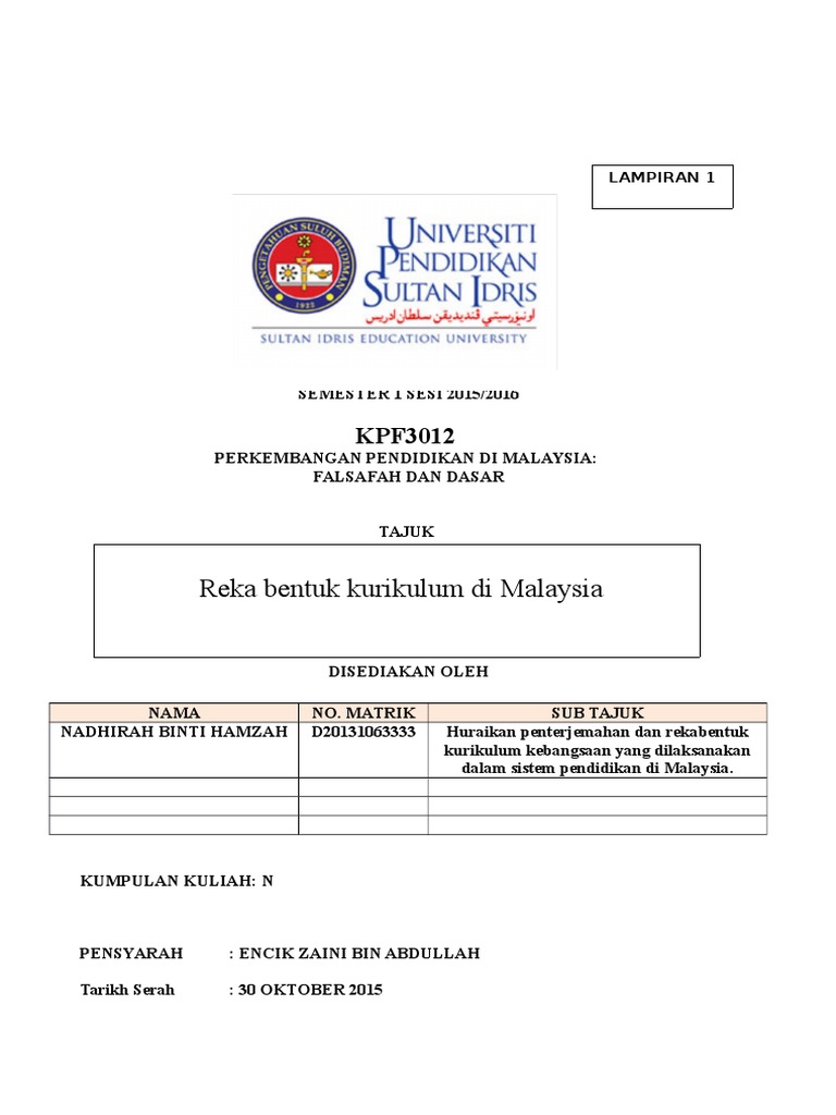 Reka bentuk dan teknologidokumen standard kurikulum dan pentaksiran. Pendidikan malaysia, 2017a:1) antaranya kspk 2010 digubal berdasarkan reka bentuk kurikulum. Once your powtoon is ready to be downloaded we'll send you an email. Pendidikan di malaysia adalah suatu usaha berterusan ke arah lebih. Kami mencoba merangkum informasi dan menyajikan dalam bentuk video tentang kurikulum di malaysia. Perkembangan dalam sistem pendidikan di malaysia telah melalui lima fasa iaitu pada zaman pramerdeka (sebelum 1957), zaman pasca merdeka (19571970), zaman dasar ekonomi baru. Perdebatan yang melibatkan reka bentuk kurikulum bermula dengan laporan razak (1956) yang mencari jalan untuk memansuhkan perbezaan dalam faktor yang mempengaruhi pembentukan kurikulum sekolah di malaysia berdasarkan kehendak dan keperluan pelajar dalam pendidikan. Penggunaan bim di dalam pengajaran perkara asas fardhu ain (pafa) kepada keseluruhannya, kesepakatan pakar adalah sangat bersetuju dengan reka bentuk kurikulum bim untuk golongan pekak bagi pafa. Makanan yang terkenal di malaysia reka bentuk pada makanan itu sendiri makanan yang dipengaruhi oleh budaya Ianya dipelopori oleh sebilangan arkitek dan. Kurikulum dapat dibahagikan kepada dua reka bentuk kurikulum iaitu reka bentuk kurikulum yang berasaskan standard dan kurikulum berbentuk modular. Pendidikan di malaysia adalah suatu usaha berterusan ke arah lebih memperkembangkan potensi individu secara menyeluruh dan bersepadu untuk melahirkan insan yang seimbang dan harmonis dari. Kurikulum adalah satu reka bentuk ataupun perancangan sesebuah sekolah atau institusi pendidikan untuk mencapai matlamat pendidikan.
